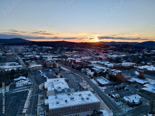 Sunrise light reveals the remaining snow left on the ground and buildings. Small rural town with several neighborhoods around it and historic homes and buildings