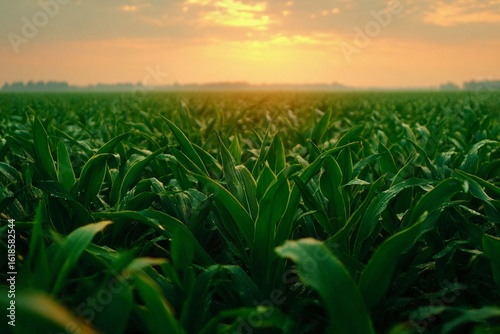Sunrise over green cornfield in rural landscape evokes calm and growth
