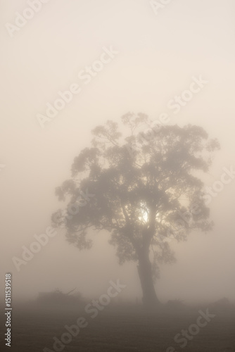 Sunrise sunlight through eucalyptus tree surrounded by hazy fog