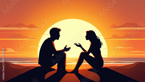 Sunset Beach Conversation Between Couple Vector Illustration