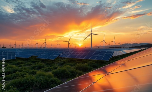 Sunset beauty at eco-friendly energy farm: solar panels and wind turbines in warm tones innovative solar panel innovation power electricity energy technology panel renewable