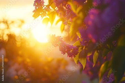 Sunset illuminating purple blossoms. Warm golden light bathes the delicate flowers, creating a serene and beautiful scene.