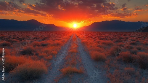 Sunset Over a Desert Landscape with a Path Leading to the Horizon