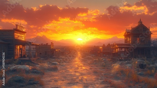 Sunset over a deserted western town, dusty road, old buildings, mountains.