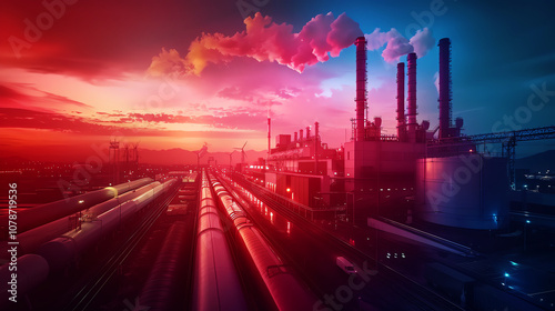 Sunset over an industrial landscape showcasing smokestacks and towering structures, bathed in striking colors.