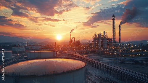 sunset over industry and the impact of oil refinery on sustainability and the environment.