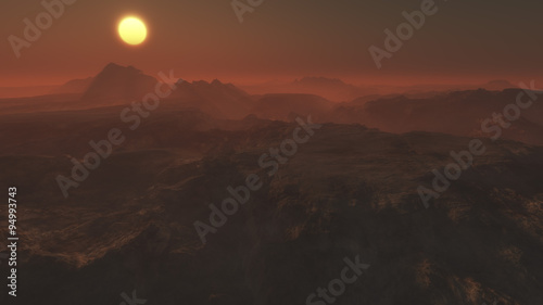 Sunset over misty remote rocky landscape.