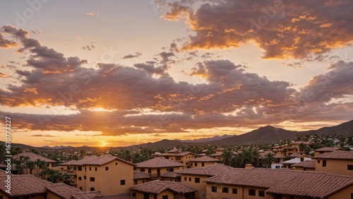 Sunset Over Mountain Village with Colorful Sky