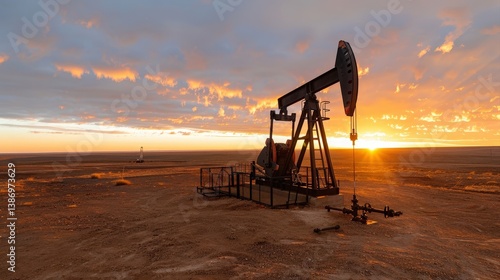 Sunset Over Oil Pump Jack in Expansive Desert Landscape with Dramatic Clouds and Warm Tones
