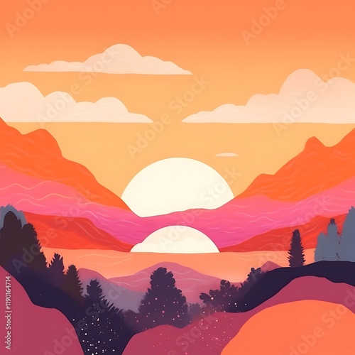 Sunset Over Rolling Hills and Silhouetted Trees