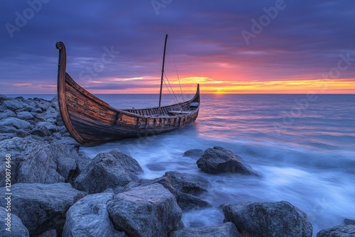 Sunset over the ocean with a traditional wooden boat resting on rocky shoreline