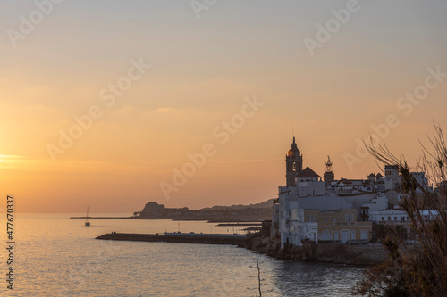 Sunset over the sea in Sitges, an old town with a beach, bars and restaurants on the Mediterranean Sea, Catalonia, Spain near Barcelona.
