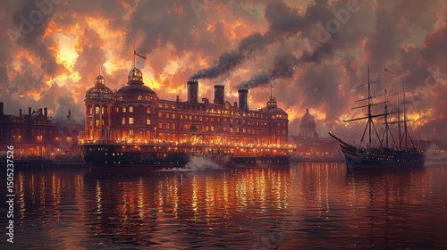 Sunset Reflections Over Historic Port with Sailboat and Steamships