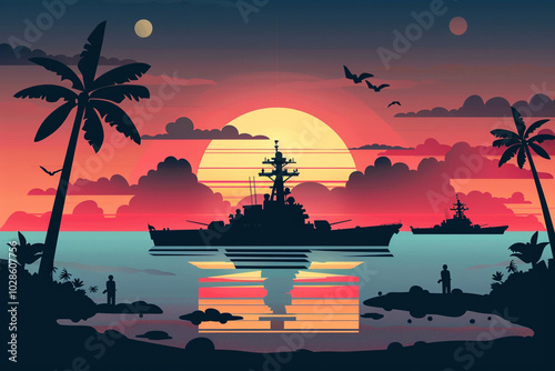 Sunset Serenity: Silhouetted Battleships and Palms in Tranquil Waterscape Reflection