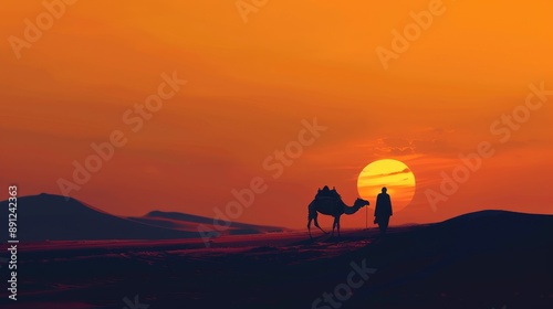 Sunset silhouette of a man with a camel, walking in the desert. Outdoor adventure with copy space