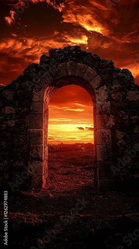 Sunset Through Ancient Archway with Dramatic Red Sky