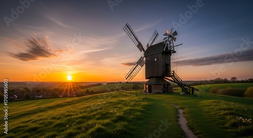 Sunset view of a windmill on a hilltop.