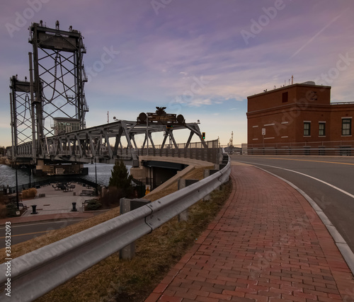 Sunset view of Memorial Bridge from sidewalk - Portsmouth, New Hampshire.