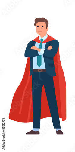Super businessman character. Men strong hero standing in costume, business people mascot, male leader in fluttering cape. Success work and leadership, vector cartoon isolated illustration