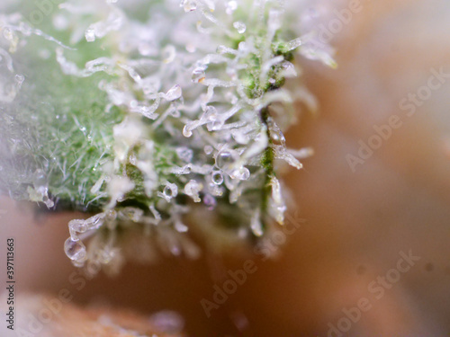 Super macro on cannabis buds, close up trichomes