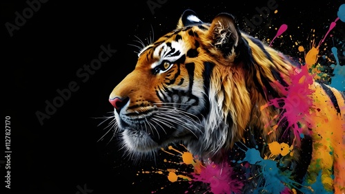 Super realistic portrait illustration of colorful tiger on black background. generated by AI