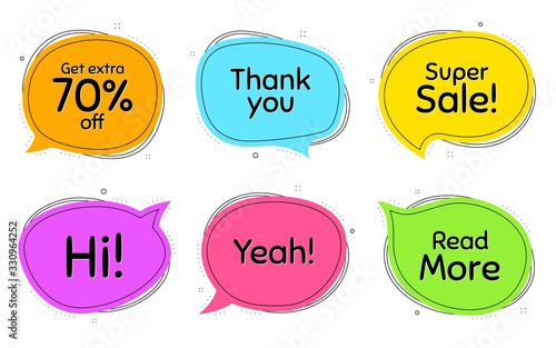 Super sale, 70% discount and read more. Thought chat bubbles. Thank you, hi and yeah phrases. Sale shopping text. Chat messages with phrases. Colorful texting thought bubbles. Vector
