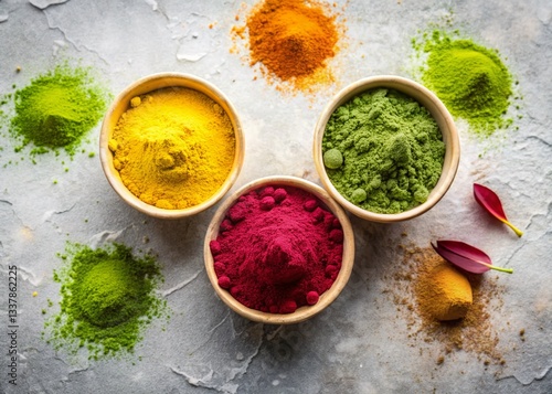 Superfood Powders: Matcha, Turmeric, Beetroot Flat Lay with Bokeh