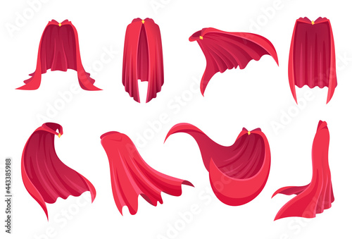 Superhero red cape. Comic textile clothes silk suits for power heroes exact vector illustrations collection