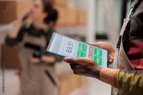 Supervisor checking inventory report using tablet computer, working at clients order preparing delivery in warehouse. African american employee supervising boxes in mail sorting center. Close up