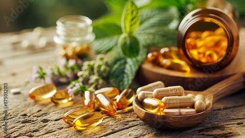 Supplements and vitamins with medicinal herbs. Selective focus. Generative AI,