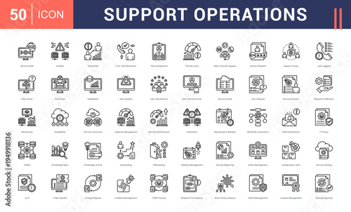 Support Operations Icon Set. service desk, incident, escalation, first-call resolution, task assignment and more. Line Style vector icons collection.