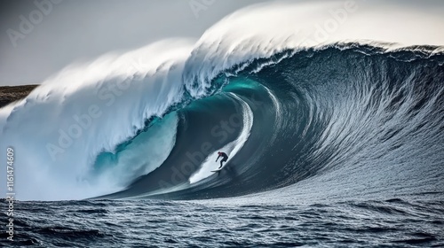Surfer riding a massive, powerful ocean wave.