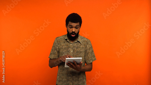 surprised african american young man with beard holding digital tablet on orange background.