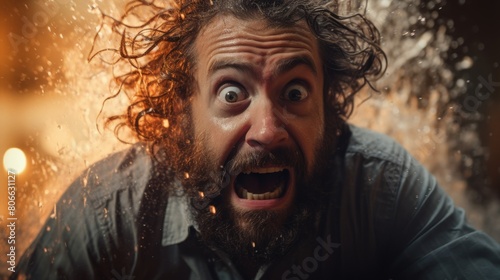Surprised man with curly beard and wild expression in snowy environment