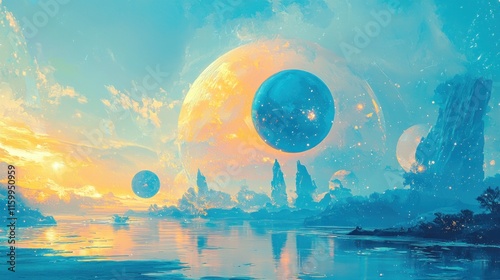 Surreal alien landscape with vibrant planets and calm water.