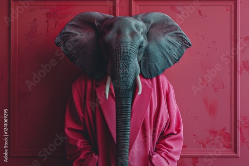 Surreal Artistic Composition of Elephant Wearing Bright Pink Overcoat Against a Vivid Red Wall, Blending Nature and Fashion Elements elephant