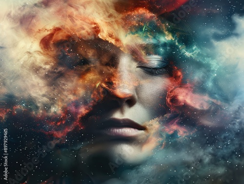 Surreal Digital Art of a Woman's Face Blended with Cosmic Nebula and Stars in a Dreamlike Universe