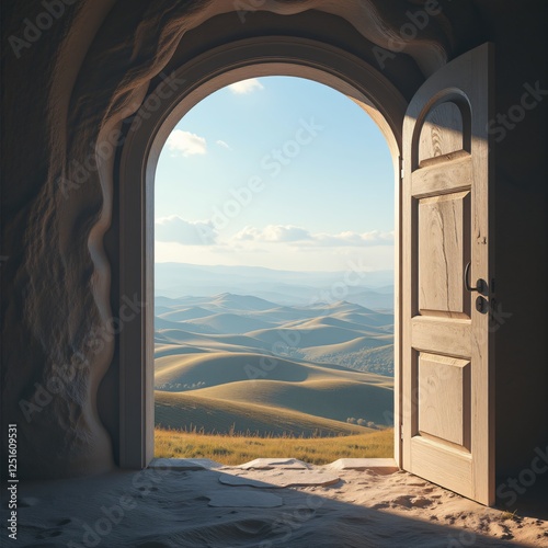 Surreal doorway opening onto rolling hills and multiple horizons - Boundless landscape with infinite horizons - Endless exploration in a dreamlike environment - Immersive visual of limitless adventure