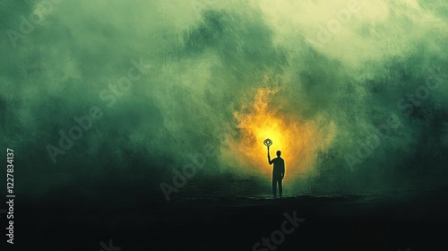 Surreal Figure Holding Glowing Key in Dark Atmosphere