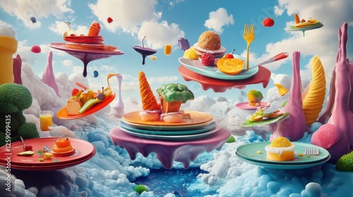 Surreal food landscape with floating plates, colorful desserts, and vibrant vegetables.