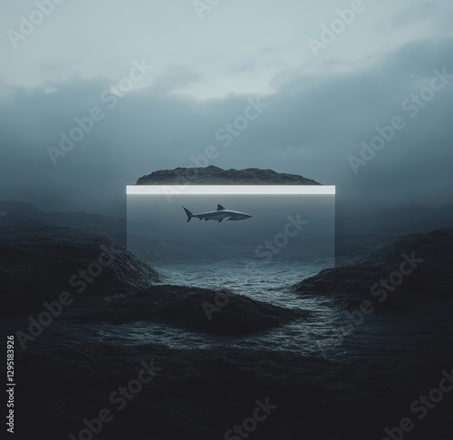 Surreal Ocean Scene with Shark in Geometric Frame Amidst Dramatic Cloudy Sky and Rocky Seascape