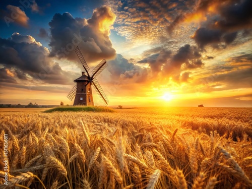 Surreal Sunset: Golden Wheat Field & Traditional Windmill