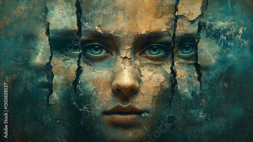 Surreal vision of schizophrenia with multiple fragmented faces, symbolic mental health concept