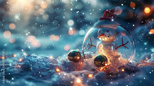 Surreal winter setting featuring a glass snowman with glowing lights swirling inside