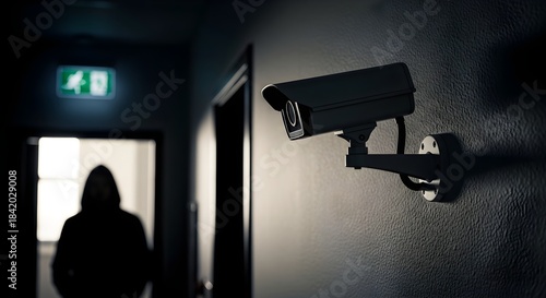Surveillance Camera Capturing Intruder in Corridor Underneath Green Emergency Exit Sign