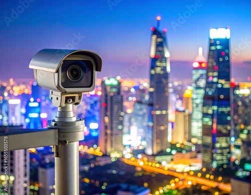 Surveillance camera overlooking a vibrant city skyline at twilight