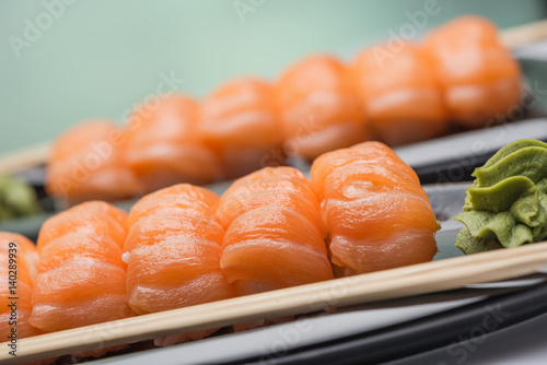 Sushi with a light-salted salmon, wooden sticks and sauce of wasabi on a ceramic dark plate
