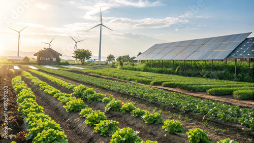sustainable agriculture project showcasing solar panels and wind turbines. lush green fields are filled with healthy crops, emphasizing eco friendly farming practices