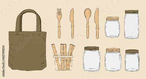 Sustainable living essentials eco-friendly kitchen and shopping tools, promoting a zero-waste lifestyle