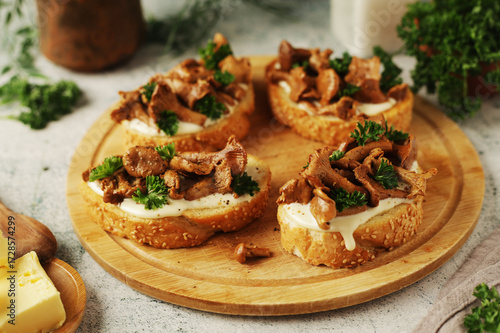 Svamptoast sandwich - a traditional dish of Sweden, open sandwiches with chanterelle mushrooms